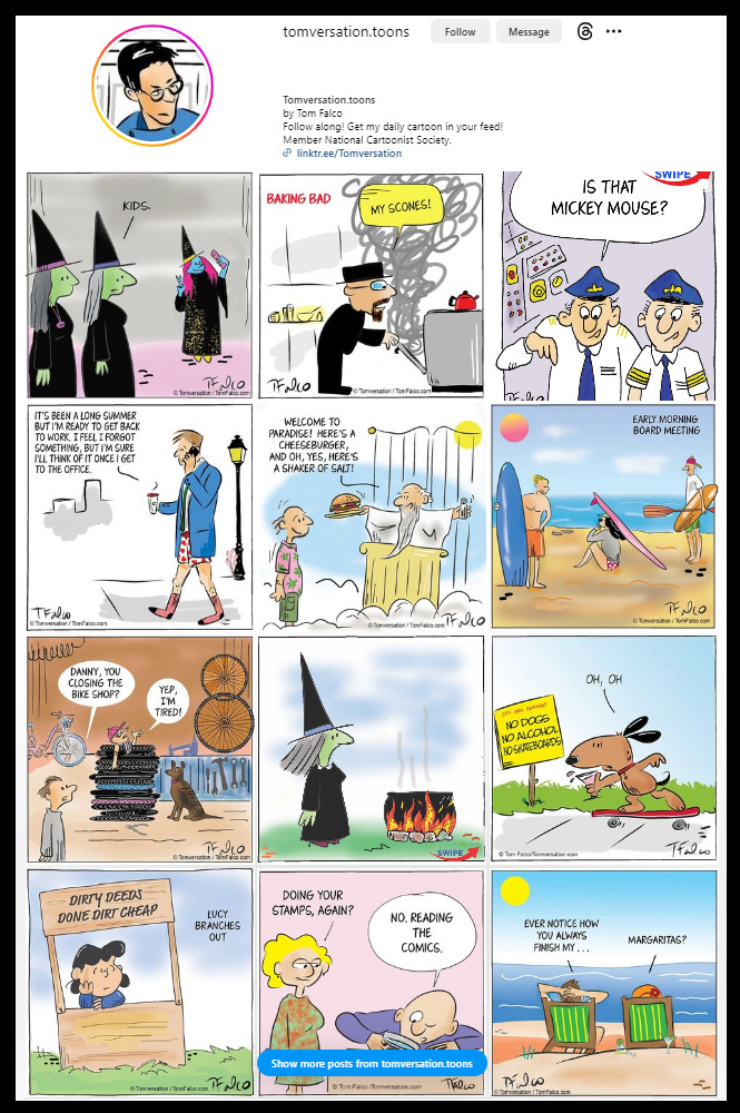 I like to create my cartoons thinking of cartoonist Jason Chatfield’s quote: “Don’t curate your art to what gets likes. Curate it to what you like.” So I’ll keep on doing it that way.