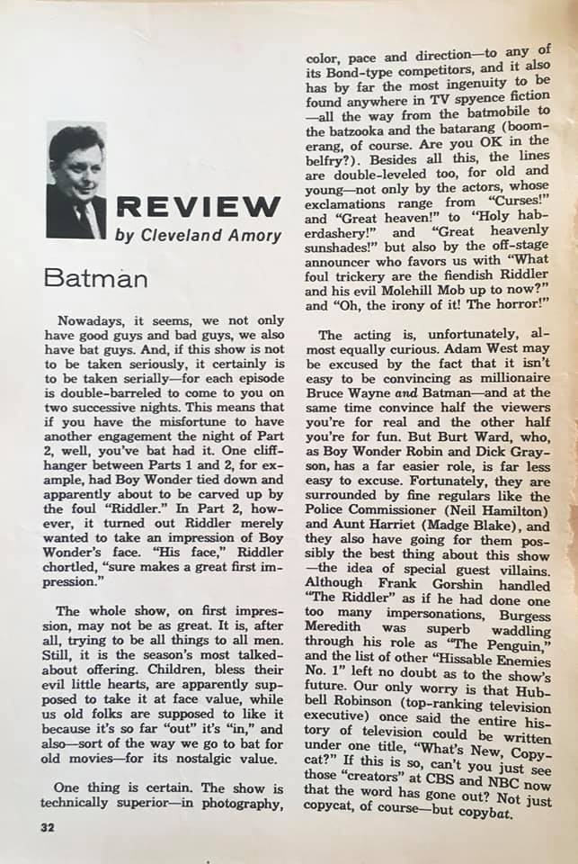 Somebody posted an old 1966 review from Cleveland Amory in the TV Guide on Facebook, which reviews the new upcoming tv show “Batman.”
