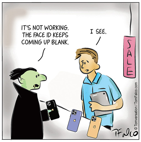 At first I thought of doing a cartoon with someone wearing a Halloween mask, but then thought of other things, like what if someone was in an accident or had a facelift or some sort of procedure where the phone would not recognize them anymore. And I remembered a previous cartoon that was published, this cartoon, where Dracula takes a selfie, only his image doesn’t come up, and from there I got to this cartoon above.