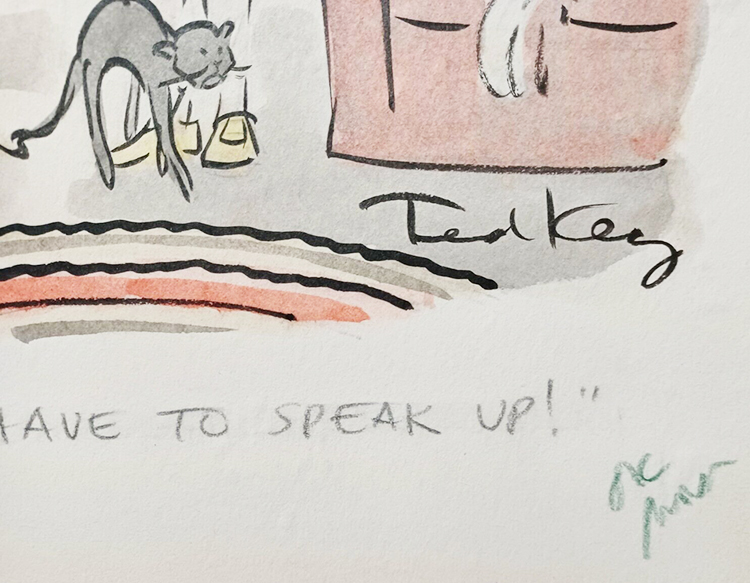 This early Ted Key ink and watercolor cartoon is done on paper that has been mounted to a board. This would have been done to give to an executive for their wall or even a retirement or going away gift. The cartoon has a hand written caption that reads “You’ll Have To Speak Up” with OK RUN written in blue pencil.