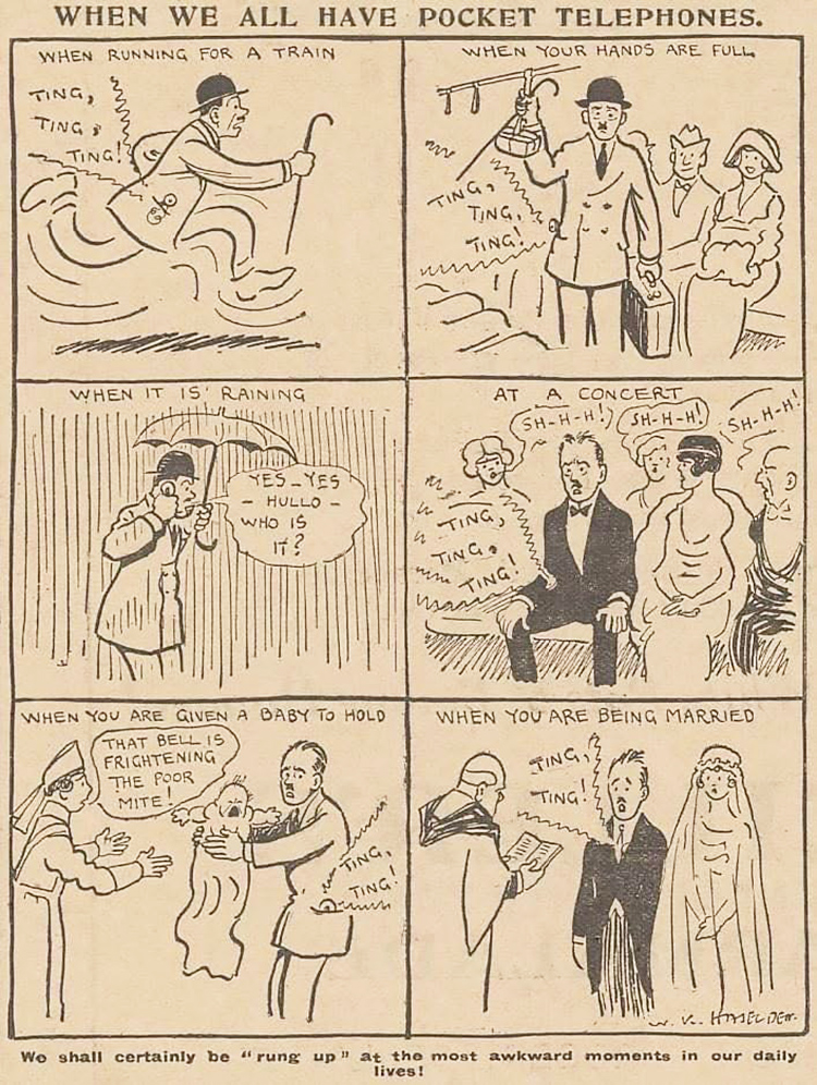 This cartoon is from 1919 – 106 years ago. It’s about “pocket telephones,” which of course were not a thing back then. Regular landline telephones were barely a thing, so it’s amazing that cartoonist W.K. Haselden came up with this concept.