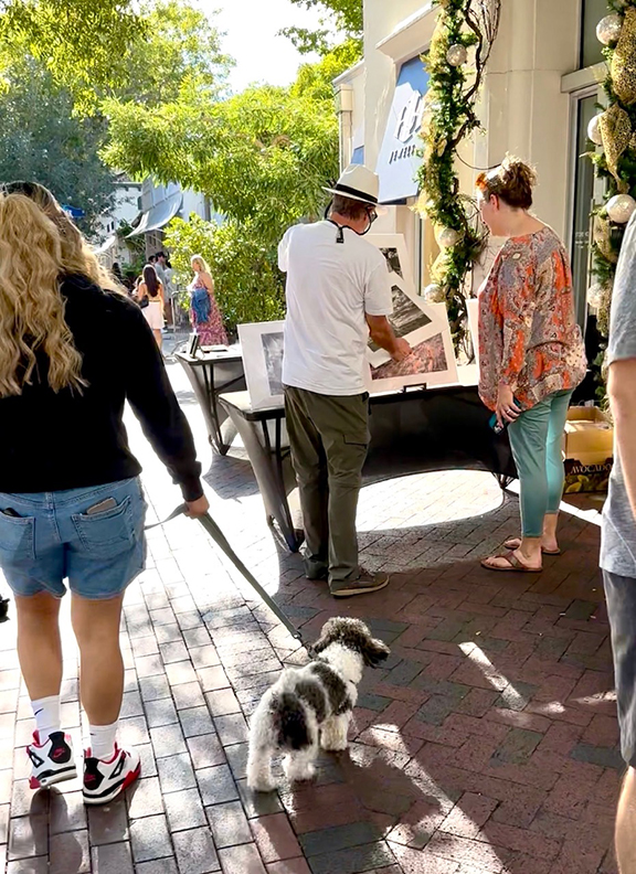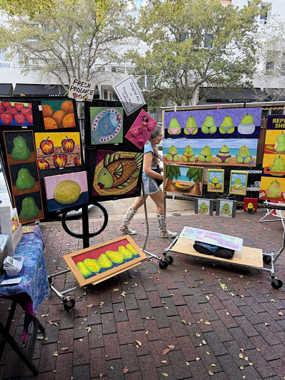 I knew a lot of the artists and many friends were there. The weather was perfect. Above are a couple of friends showing and selling their art – at left is Eileen Seitz and at right is Theresa Callouri, walking behind her fruit art, both excellent artists.