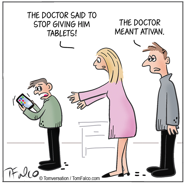 I didn’t know which type of tablet would be funny that children take – Tylenol? Flintstone vitamins? I let the cartoon sit for a day or so, which I do with many of them – making drawing changes and many times I make text changes.