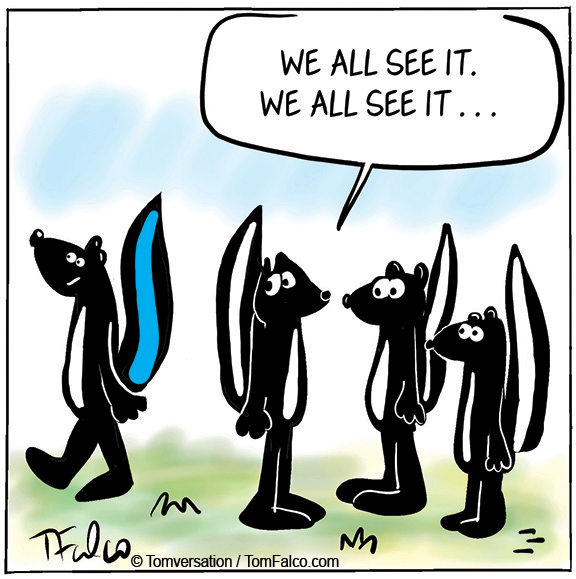 I have a friend who doesn’t watch much tv. When he saw my skunk- “We all see it” cartoon, he thought it was a political statement because of the blue streak, but of course thousands of you got it as a parody of the Progressive tv commercial, which is also a “part of the culture” thing.