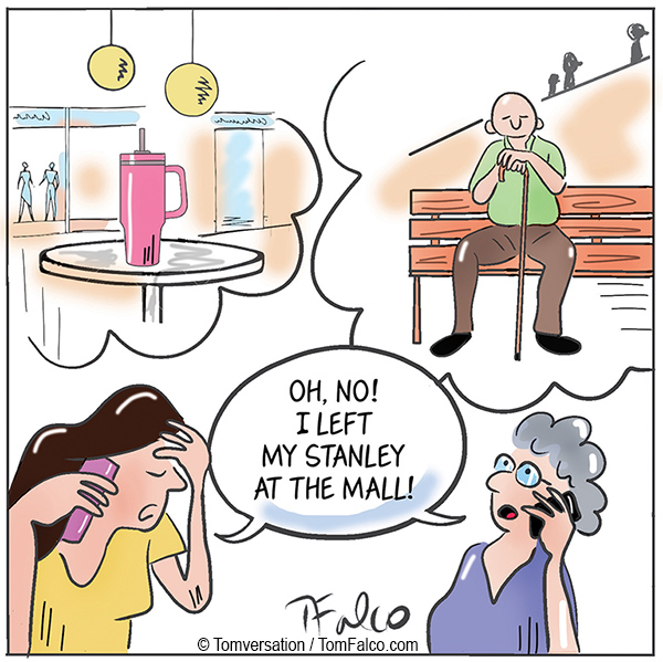 Malls are making a comeback thanks to Gen Z and I featured one in a Tomversation cartoon from this week. Stanley tumblers and an old man named Stanley are featured, too! For those who listen to this post, (I found out recently people listen rather than read this), there is a cartoon above and one below. You might want to see them since this story is about them.