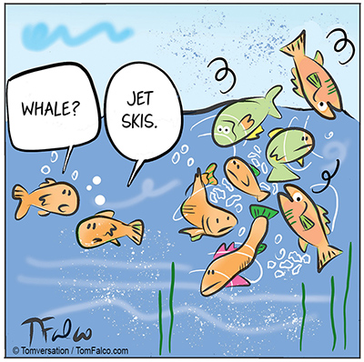Today’s cartoon is more editorial or commentary than funny. It’s about the scourge of our oceans – the jet ski.