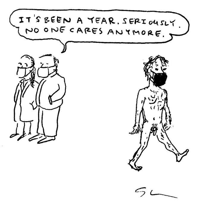 I’m thinking of this cartoon because toward the beginning of the pandemic, last May, I was with a friend at a bar, which was closed, but had an open pick-up window for food pick-up, and my friend was talking to the naked guy who was the only person on the street with a mask! He wasn’t naked at the time, he was wearing a t-shirt and shorts. But I found it funny that about 12 people where there and the only person wearing the mask was the usually naked guy – all covered up – on his face that is.
