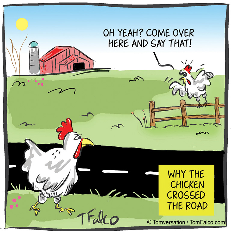 I have two cartoon styles – one was designed to be a “New Yorker style” and the other is the one I have used all my life, I call a Hanna-Barbera style, or “Flintstones style.” So I have accommodated my work to fit in with the New Yorker, and I like it. I go back and forth, depending on the gag, to see which drawing fits.