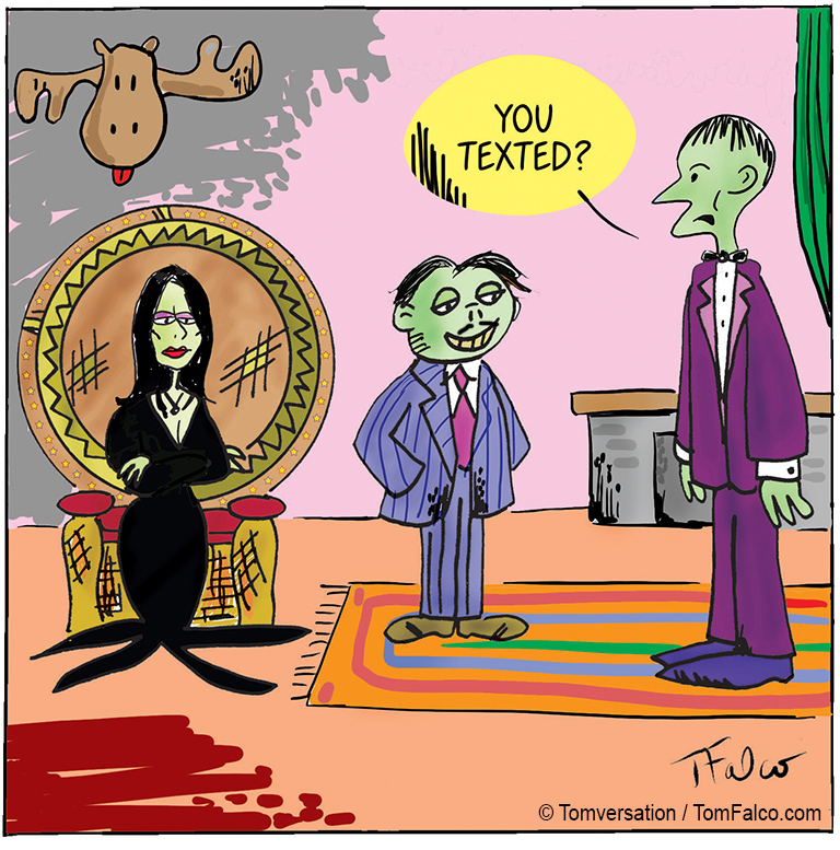 Today’s cartoon over at TomFalco.com is of the Addams Family. I drew this a few years ago, but I keep seeing them in the new Progressive Insurance commercials, so I thought I would dust it off and bring it out. There’s a new Addams Family movie coming out October 1. The cartoon originally had Lurch saying, “You Tweeted?” but I thought texted sounded more personal for the Addams household.
