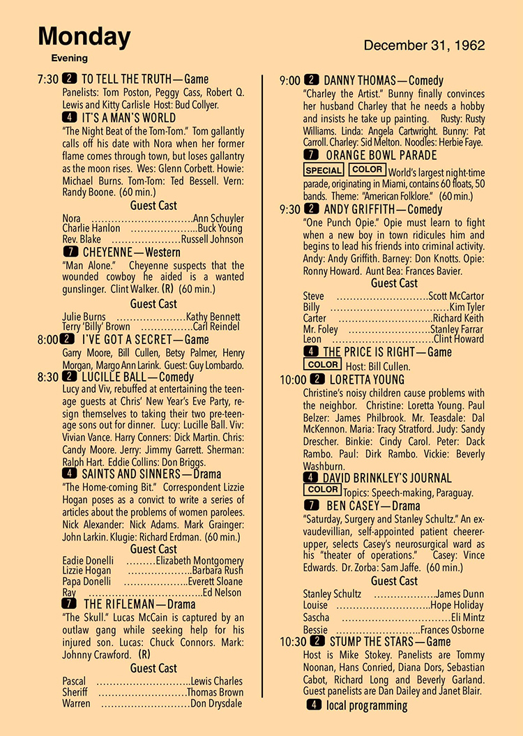 Saw this old tv guide page on Facebook. It’s from December 1962, a Monday night. Looks like a NYC edition by the channel lineup.
