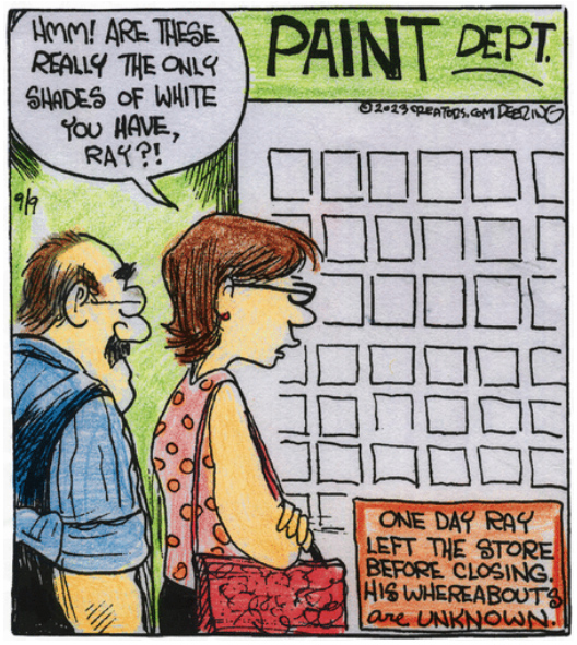 The “shades of white” cartoon reminded me that one day these guys showed up to show us shades of something – I think it might have been for an awning in the front of the building, it might have been tiles, I can’t remember.