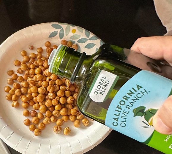 I washed the chickpeas to get all the salt off and let them dry in the air on paper towels – about an hour. If you let them dry, they’ll come out crunchy.