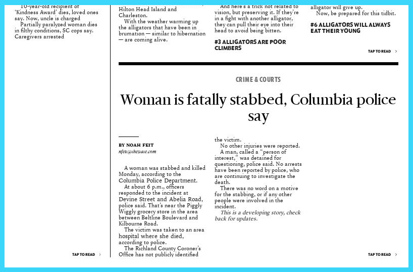 One thing I noticed, with just The State newspaper so far, there might be more, is that they just end a story on the page and leave white space. Now maybe since I’m reading it from another state, ads are there and they just don’t show where I am reading from, but I don’t think so. I saw on the front page of the Sun-Herald, the Biloxi, MS newspaper, this big gap next to the masthead, but inside the paper, there is none of this white space stuff.