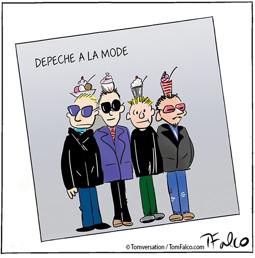 I drew this cartoon in 2019. I’ve been holding on to it because I was thinking of redrawing it – having the guys in ice cream, you know, sort of lounging in a banana split or something. But I left well enough alone and just made it look like a new album, which, as I said, is now out. It’s called Memento Mori, which means “Remember You Must Die,” which is a bit morbid, because fellow band member, Andy Fletcher passed away in May 2022.
