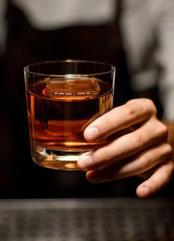 Previous Image Next Image Professional bartender serving a cocktail in the glass with one big ice cube Professional bartender serving a cocktail in the glass with one big ice cube on the bar counter in the blurred background